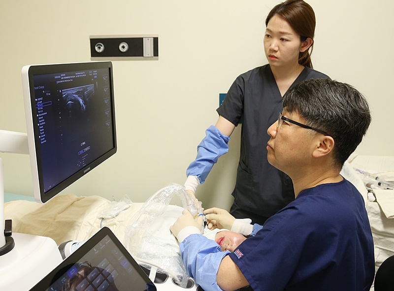 Professor Baek, Jung-hwan of the Department of Radiology (front) is performing RFA on a patient with recurrent thyroid cancer.